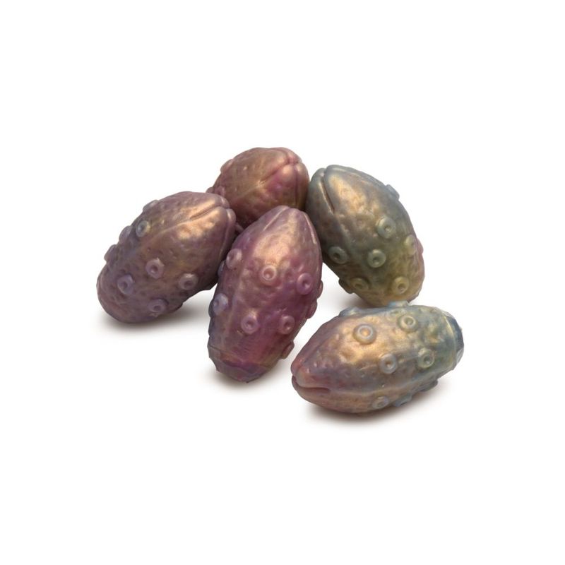 Its time to get bred by alien visitors. This thick, textured shaft from Creature Cocks is one of the most colorful yet with a mix of rich, vibrant, iridescent colors with shades of pink, green, orange and purple. The shaft itself is large and thick with tiny bumps on the head, ribbed texture along the opposite side, and a mixture of textures along the rod down to the wide, suction cup base. It can be used hands-free with the assistance of the suction cup or combined with a compatible harness for penetrating strapon play or pegging! Insert any or all of the four larva eggs into the hollow sheath and then insert them into your hole, letting the ovipositor deposit those eggs to be birthed out of you later after youre full! Made out of flexible, super soft, premium silicone both the dildo and the eggs are phthalate-free, body-safe, and best used with water-based lubricants only. To clean after, use warm water and mild soap then spray with a toy cleaner before patting dry
