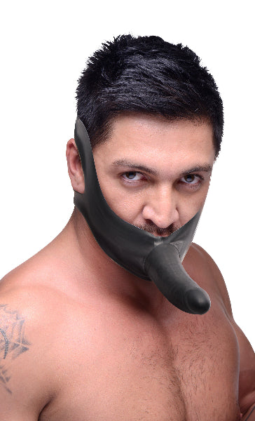 Get up close and personal with the Face Fuk from the Master Series. This stretchy, all-latex strap on is designed to fit over the mouth or chin. You or your plaything can use it as a gag, or wear it on the chin which leaves the tongue free to roam as the dildo penetrates. The rigid black dildo is nice and stiff, with just enough give to the lifelike shaft. Comfortable and sturdy, the stretchy rubber straps run behind the head and beck, keeping it in place and stretching to fit most any size and shape.