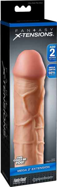 The Mega 2" Extension is a customizable extension that can be easily trimmed at the base for a perfect fit. It's super-stretchy to accommodate most sizes and snug enough to help you last longer. Your partner will enjoy deeper penetration with the 2" extension at the tip, while the ultra-lifelike shaft makes you 66% thicker all around. The soft Fanta Flesh material feels just like a second skin, giving you the length, girth, and confidence you need to satisfy your lover.
