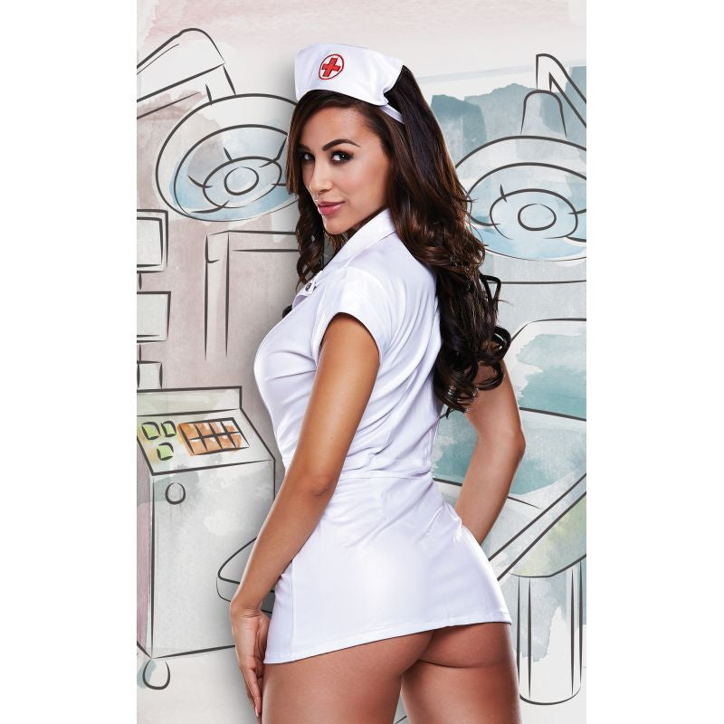 This classic nurse costume is sure to raise the blood pressure. It consists of a white vinyl button up dress with red accents and a little hat.