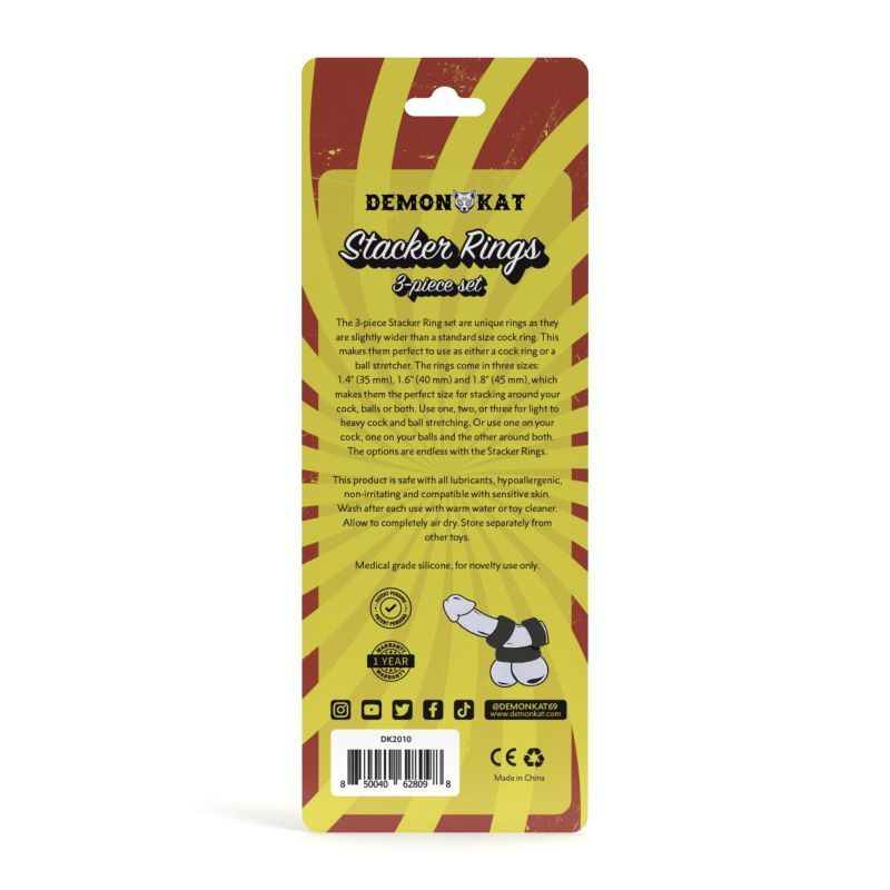 The 3-piece Stacker Rings set are unique rings as they are slightly wider than a standard size cock ring. This makes them perfect to use as either a cock ring or a ball stretcher. The rings come in three sizes: 1.4” (35mm), 1.6” (40mm) and 1.8” (45mm), which makes them the perfect size for stacking around your cock, balls, or both. Use one, two, or three for light to heavy cock and ball stretching. Or use one on your cock, one on your balls and the other around both. The options are endless with the Stacker Rings.